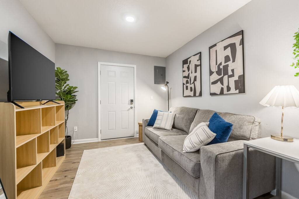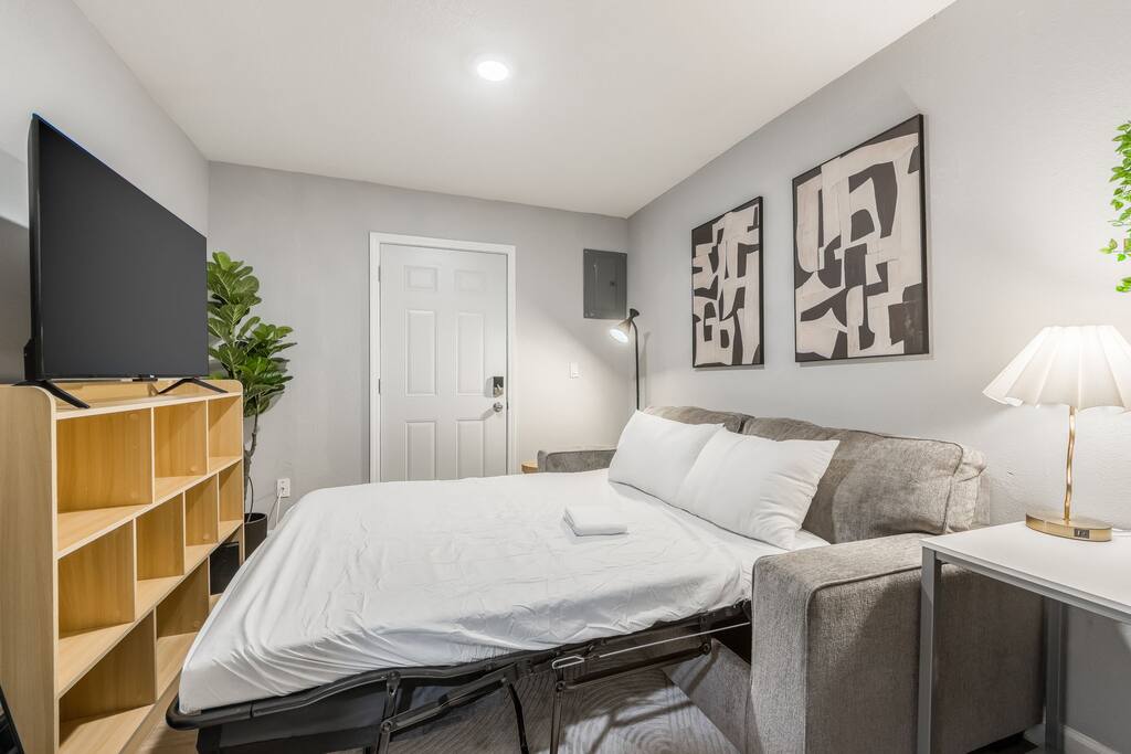 ✦ What our guests love about our listing: ✦ - Wheelchair accessible - Check-in process is Keyless entry with code - FREE available parking - Cozy desk + ergonomic chair - Fully equipped kitchen - Coffee K cups provided - Lightning fast WiFi on our large 50" SMART TVs - Huge KING Bed with luxurious sheets - Convertible couch in the living room for flexible accommodations - Thoroughly professionally cleaned and sanitized before every stay - Professionally cleaned and sanitized between each and every guest - Professional on demand laundry services available